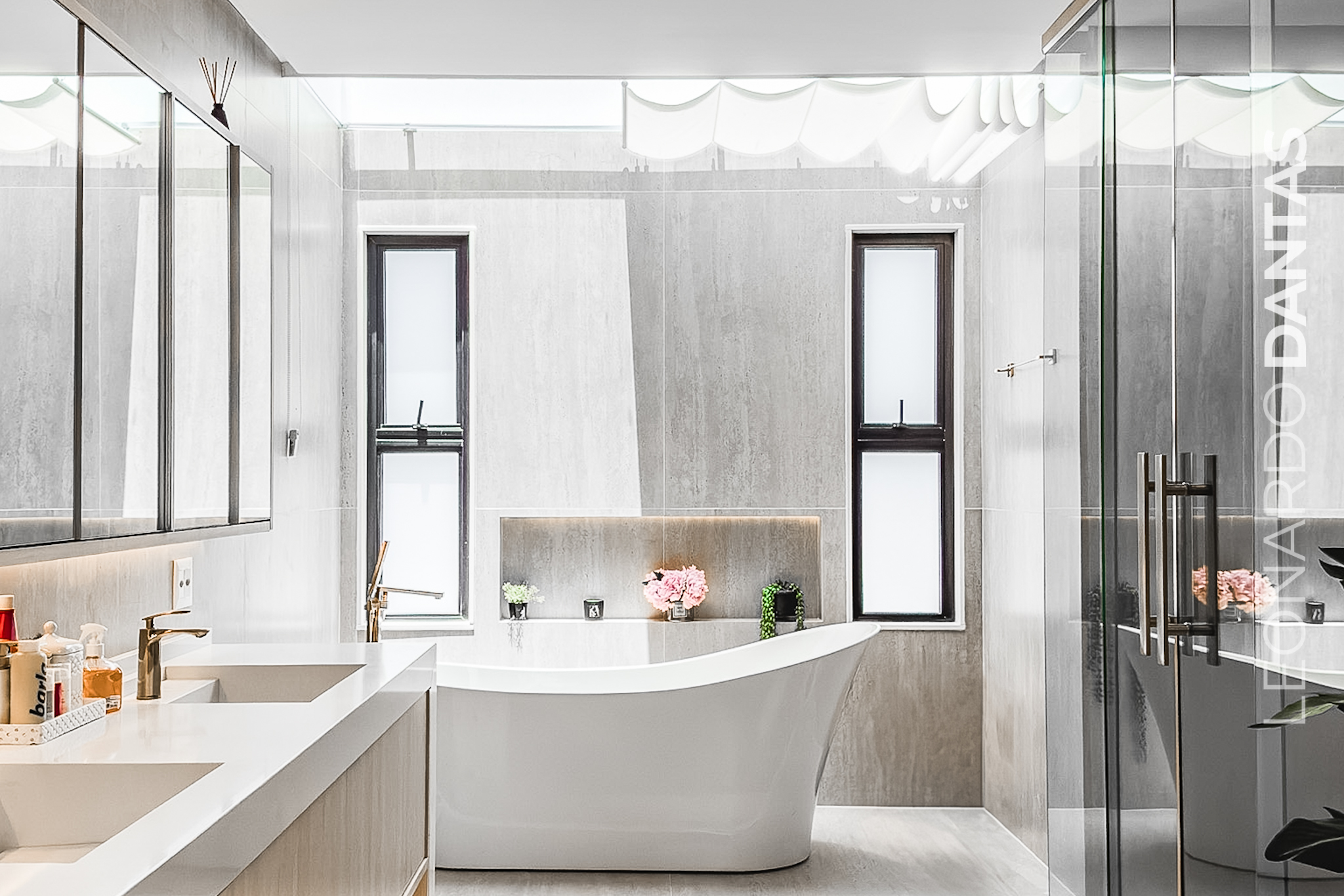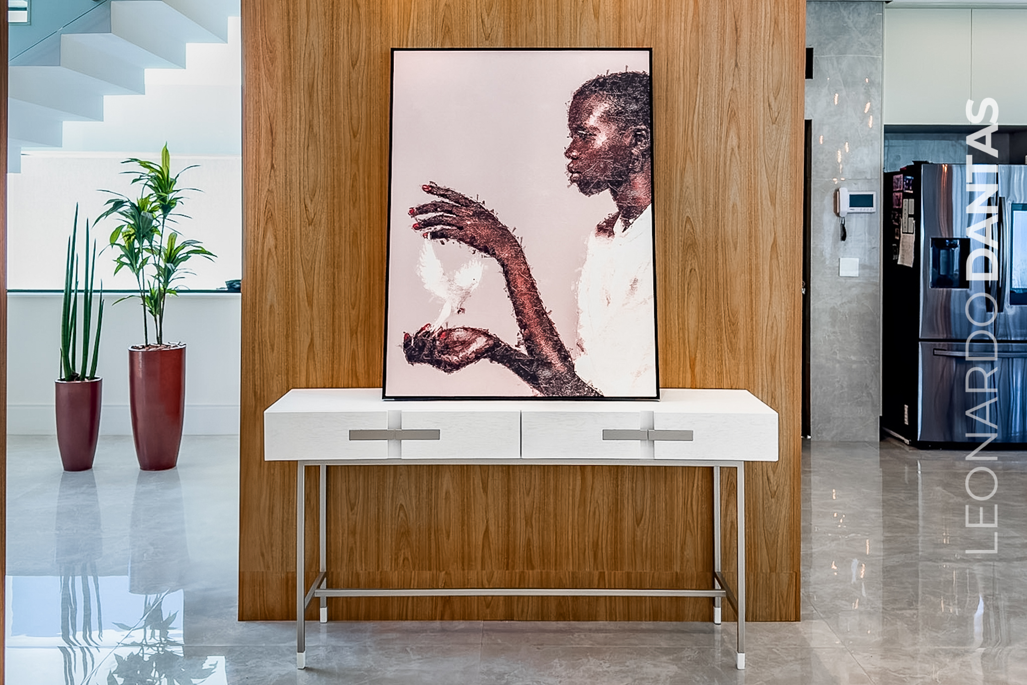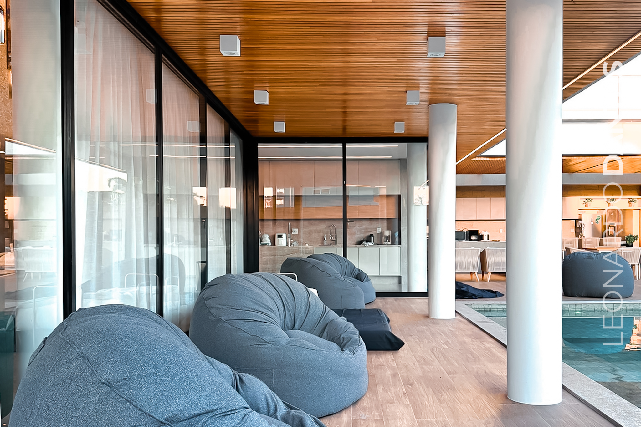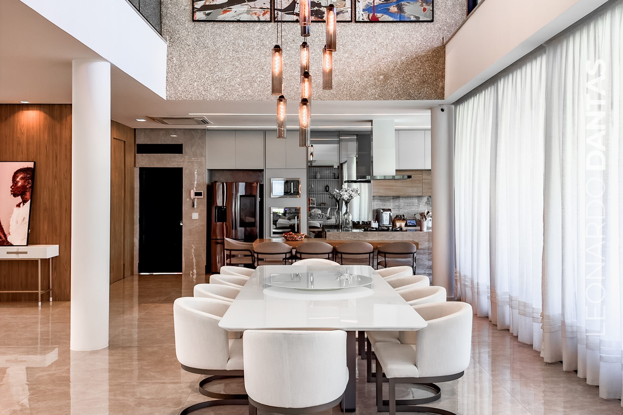 1º pavimento : Um hall de entrada com pé direito duplo, porta pivotante de piso a teto, sala em 4 ambientes, sala de TV toda equipada, sala de estar e jantar. Além disso, conta também com 1 suite térrea completa e lavabo. Cozinha completa e equipada em conceito aberto, com despensa. Possui suíte de colaborador privativa, com entrada e saída independente.