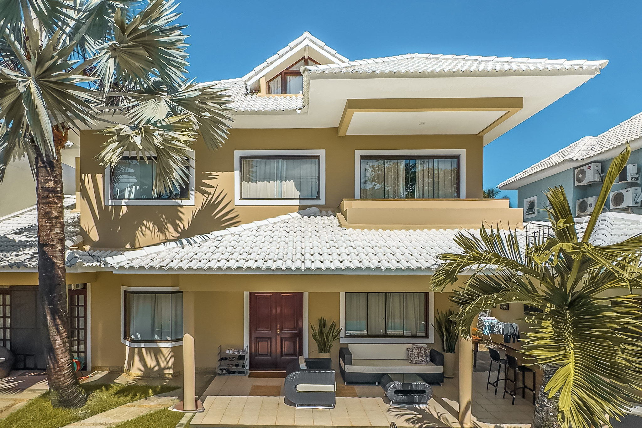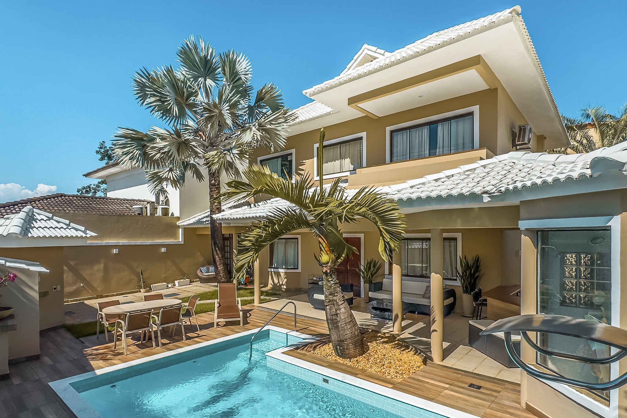 Com 5 quartos (3 suítes) e 2 vagas, está localizada no centro do terreno, garantindo ventilação cruzada e privacidade total.